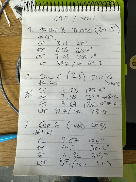 We started with three distinct roasts of the coffee using small 100g samples, using a Nucleus Link sample roaster; Filter, Omni and Espresso roast profiles.